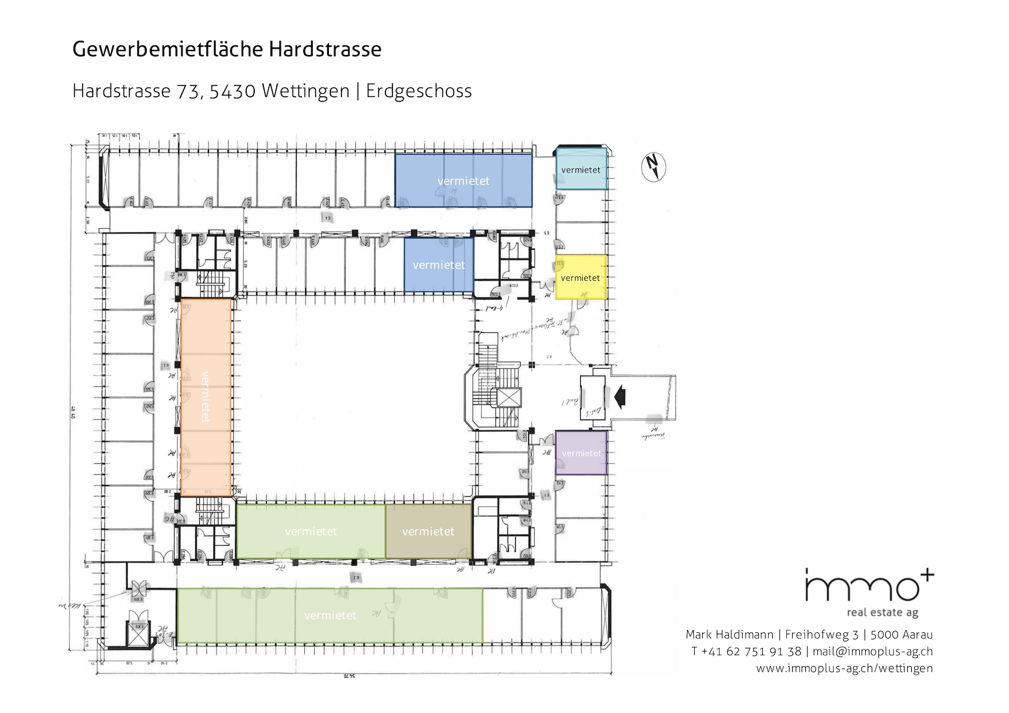 Die Hardstrasse 73 bietet Platz für Büros und Gewerbe. Gemietet werden können Büros ab 25 m². Es steht auch eine Rampe für Anlieferungen und ein Empfangsbereich zur Verfügung. Im Weiteren liegt in der Mitte des Gebäudes ein gepflegter kleiner Wandelgarten zudem befindet sich im UG eine Cafeteria mit Garten.